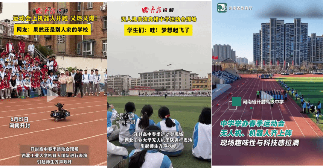 无人机团队和WMJ战队受邀为开封高中春季田径运动会开幕式进行科技展演。由团队自主研发的2台舞蹈机器人以及2架无人机带来表演,将现场气氛推向高潮。表演结束后,西工大科技表演团队还向开封高中领导以及师生展示无人机以及机器人技术细节,并介绍相关专业的课程设置与就业前景。本次西工大科技亮相中学运动会受到社会广泛关注,多家媒体报道。