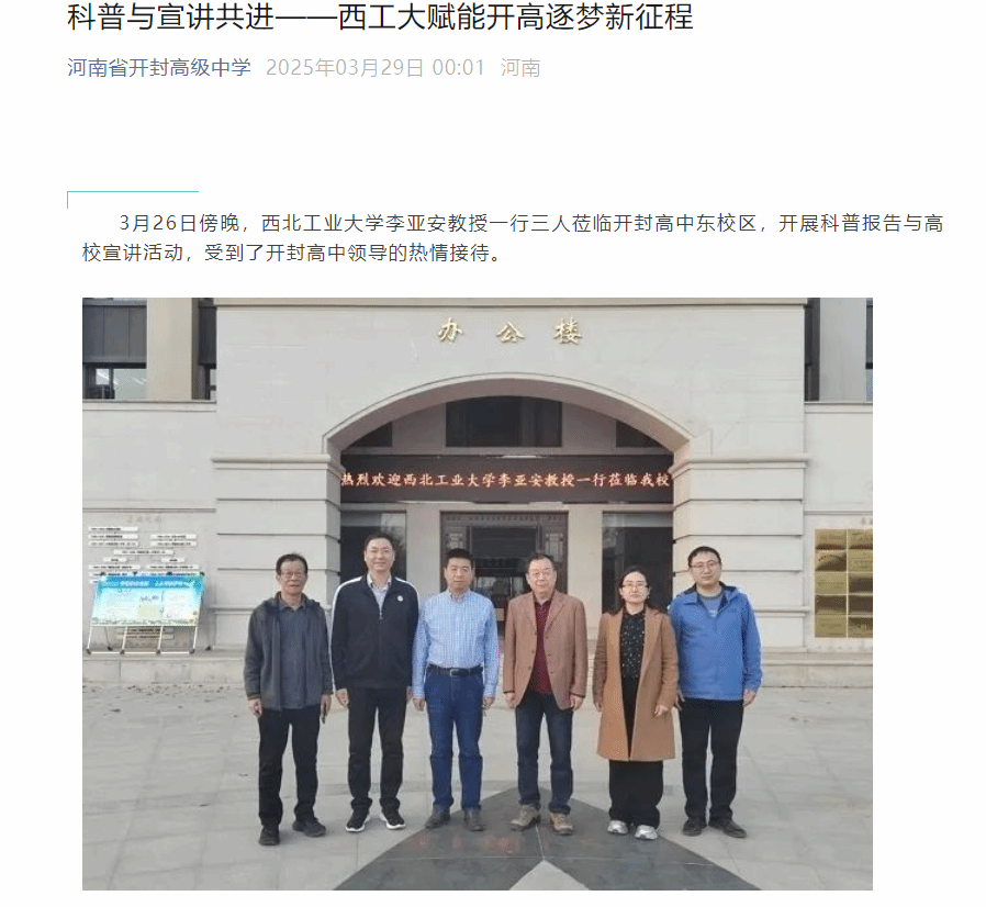 网络与机器人系统系师生融合党支部书记张伟伟、教师郗润平,航海学院李亚安教授一行以及来自无人机团队和WMJ机器人战队的8名西工大学子于25-28日赴开封市杞县中学、开封高中和河南大学附属中学三所重点高中,开展为期四天的“科技进校园”系列活动。活动涵盖科普讲座、招生政策解读、赠送喜报及科技展演等内容,累计吸引超2500名师生参与,掀起校园科技热潮。