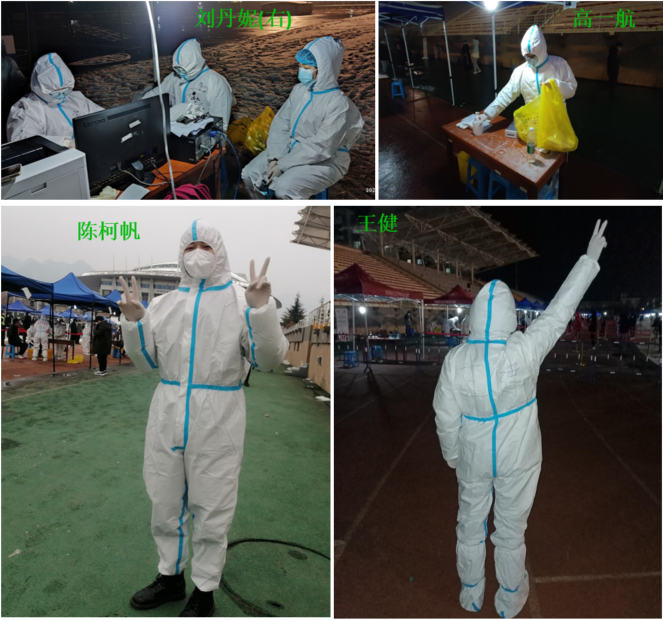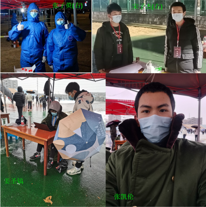 本科2020级多名学生挺身而出,担任了核酸检测工作志愿者,负责核酸检测师生健康码、身份证、一卡通的核对以及后台数据的处理等工作。尽管天气寒冷,防护服的束缚与长时间站立让志愿者们有些疲惫,但志愿者们毫无怨言。巨乳