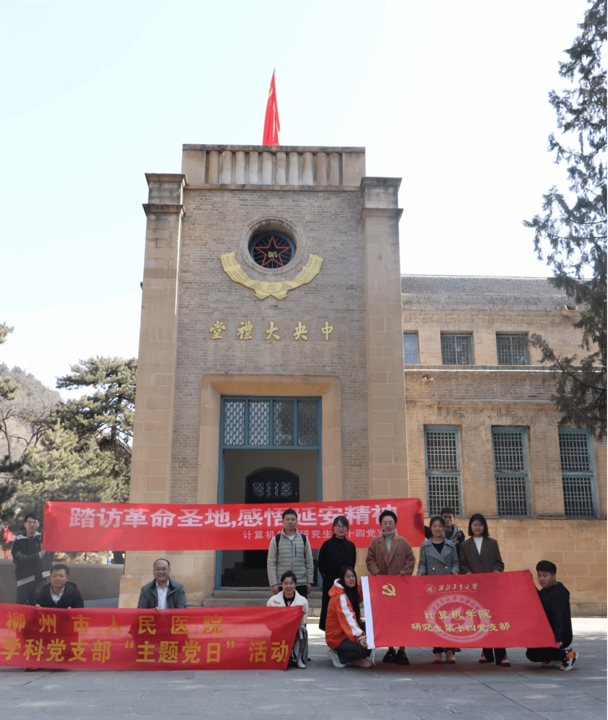 在中央大礼堂门前,研究生第十四党支部同远道而来的柳州市人民医院下属党支部共同开展了主题党日活动,双方共同交流了基层党支部建设经验,以“我身边的优秀共产党员”为主题分享榜样故事,回首入党初心,感悟延安精神。