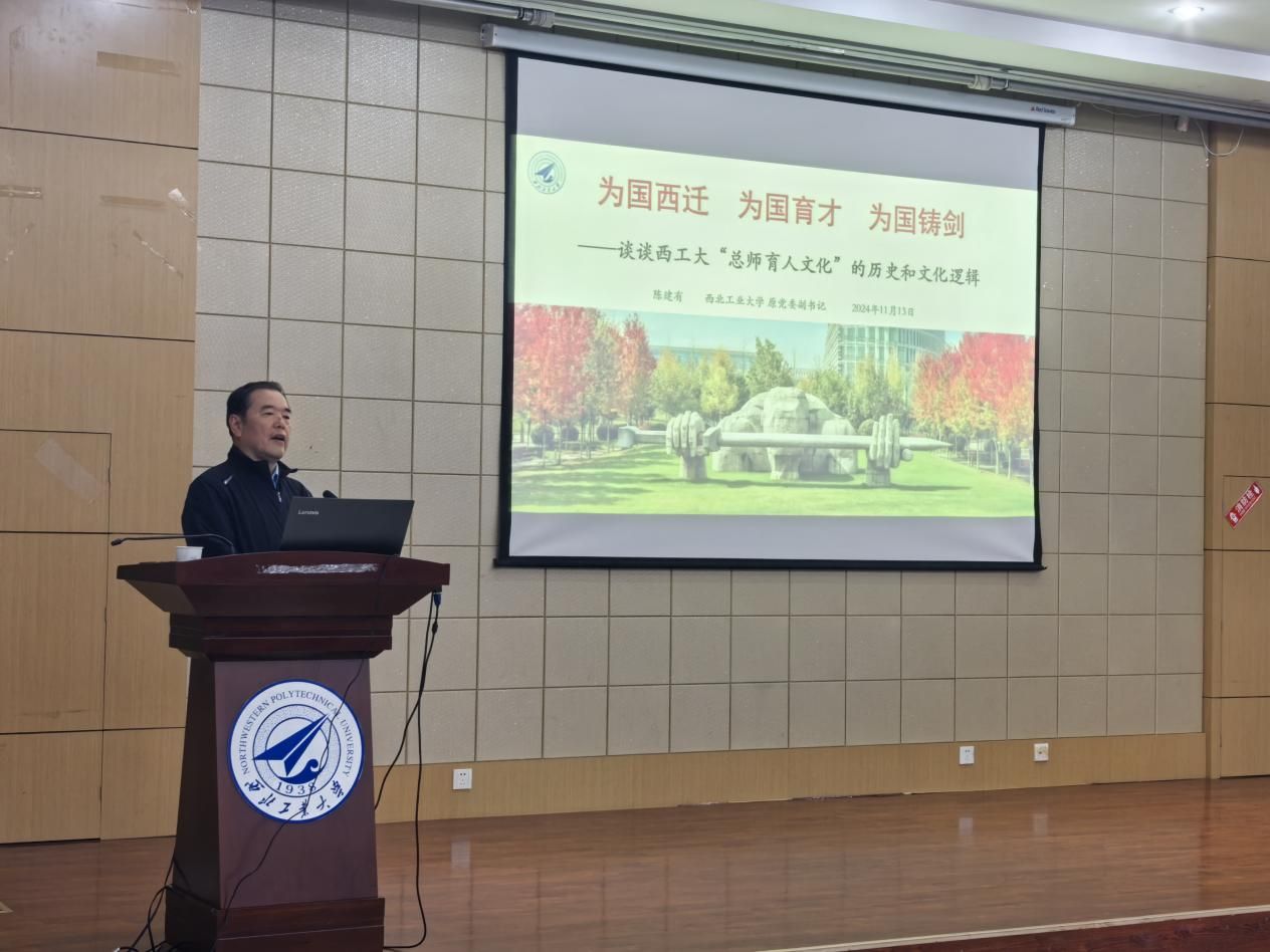 “总师育人文化”的丰富内涵和历史渊源。他回顾了西工大的西迁历程,展现了学校在国家重大战略需求中的重要作用及西工大人的家国情怀和奉献精神。通过列举杰出校友和“总师”人物,展示了西工大在航空航天航海等领域的重要贡献,并深入阐述了学校“为国育才”的教育理念。他强调,西工大始终以培养具有家国情怀、创新精神和实践能力的高素质人才为根本任务。在“为国铸剑”部分,陈建有结合西工大在国防科技领域的成就,讲述了学校科研创新与国家战略的紧密结合,在为国家科技实力和国防力量做出的贡献。他鼓励师生继承和发扬西工大的优良传统,为实现中华民族伟大复兴的中国梦贡献力量。