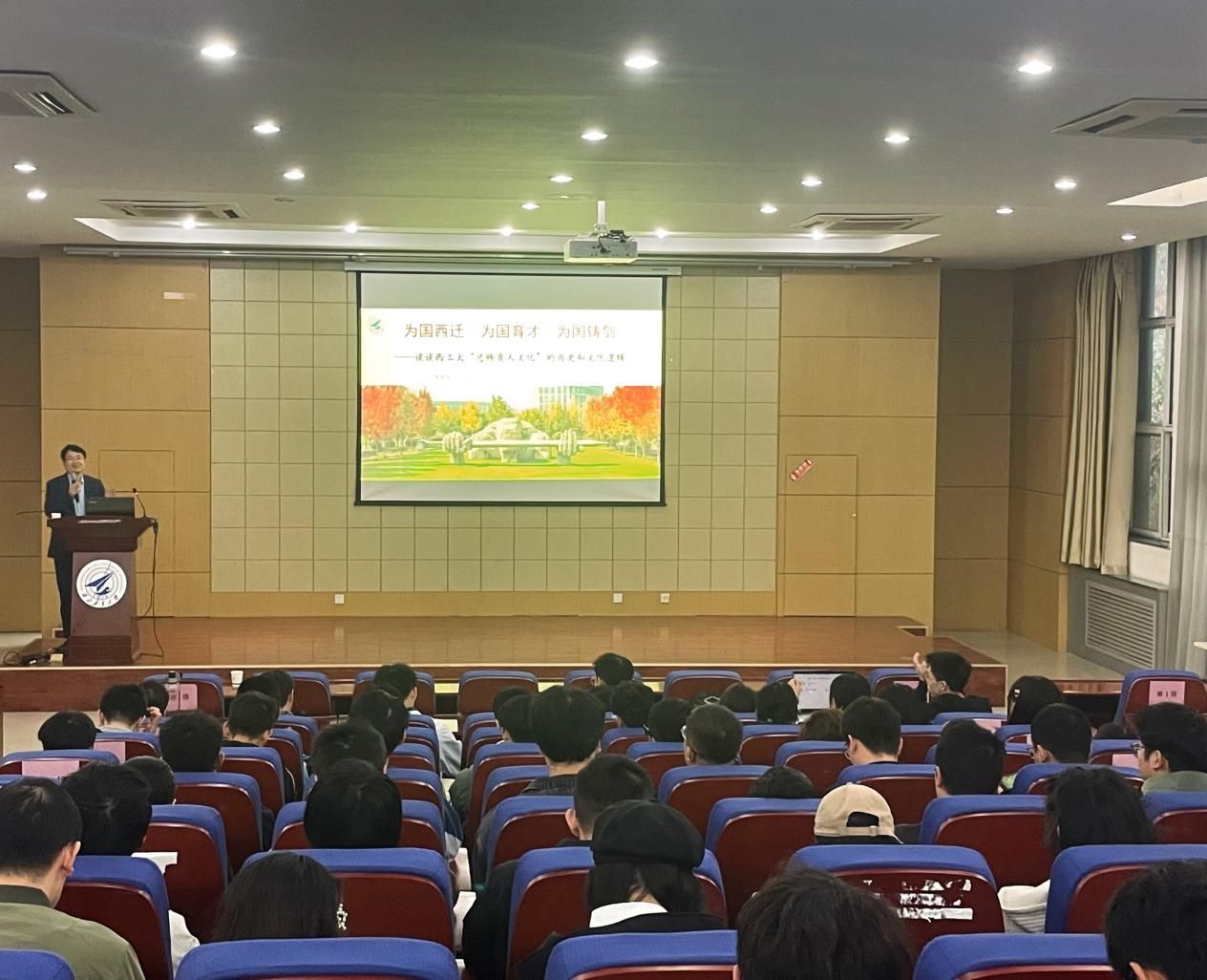 报告厅为师生带来了一场题为《“为国西迁、为国育才、为国铸剑”——谈谈西工大“总师育人文化”的历史和文化逻辑》的讲座。本硕博学生100余人参加,讲座由学院党委书记李春科主持。