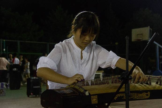 吉他协会的两位小哥哥带来深情的吉他弹唱,悠扬动听的旋律感染了现场同学,把大家的思绪带回到了遥远的家乡;九弦音器乐队的古筝表演,瑟瑟琴声洗涤了夏天的溽热,将同学们带入了安宁祥和的音乐世界;由彭力贤学长带来的独唱《友情卡片》,让同学们深深地记住了这个他们辛苦过拼搏过的夏天;由唐颖萱学姐带来的独唱《去流浪》让每一个因军训疲惫的学弟学妹都瞬间精神振奋起来;黄敏婷学姐为大家带来了独唱《你敢不敢》,学姐以甜美的歌声扫去了军训的学弟学妹们一天的疲惫,同时以有力度的演唱为他们注入了勇气,大家将以勇敢自信的态度,迎接接下来的军训生活以及大学生活。