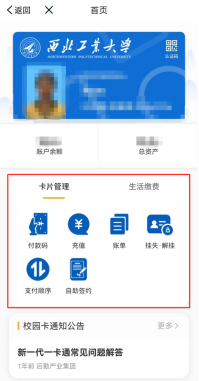 学生可点击“一卡通”进行校园卡相关操作页面,也可直接点击巨乳右上角“充值”快速进入一卡通充值界面。