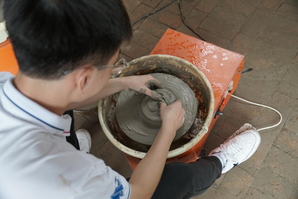 据刘师傅的介绍,尧头窑黑瓷工艺对外号称有72道完整工序,外行人看着会以为在夸大,实际在他们更加专业的制作途中甚至还不止72道工艺。每一个瓷器从他的原材料取材、原材料练为可用材料、基本形状捏制、精修到烧制,每一道工序都不容小觑,更绝不能马虎,否则一个小细节的失败便是一个月努力的白费。且黑瓷工艺至今都是纯手工制作,人工的创造性也决定了它每一件工艺品的唯一性,每一个茶壶对应的盖子都是独一无二的,一个黑瓷壶没有两个完全适配的盖子,这严谨的工艺便也是限制了尧头窑黑瓷产量的一个关键因素。黑瓷、釉等最终产物的所有取材均来自当地纯天然的材料,这一点让同学们大吃一惊,没有想到,这看似天差地别并细腻无比的材料竟然都来自矿石、泥土。古人对大自然的开采和应用着实是一种珍贵的财富。