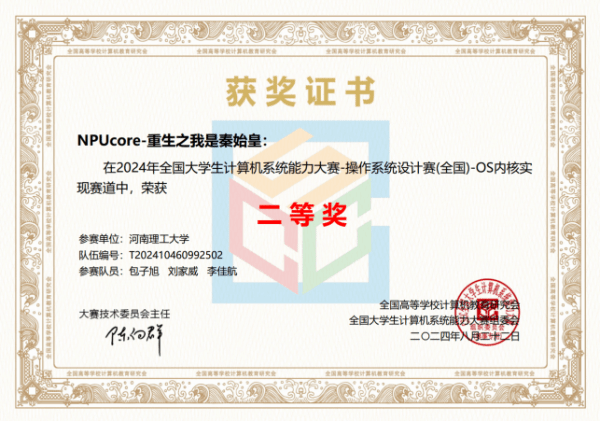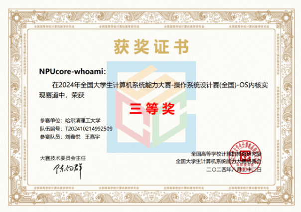 本科生冯宜湑与软件学院张逸飞和网安学院张瀚宸组成的“NPUcore-IMPACT!!!”队伍获得LoongArch内核实现赛道一等奖。该队伍的NPUcore-IMPACT内核使用Rust编写,基于龙芯架构支持2K1000开发板及其虚拟机,支持106个系统调用和FAT32/EXT4文件系统,并在初赛决赛取得最高分,成为该赛道唯一libc-bench得分队伍。