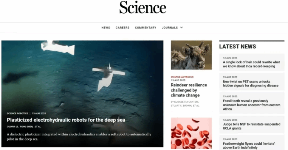 近日,我院人机物融合智能计算团队负责人於志文教授参与完成的最新研究成果“Plasticized electrohydraulic robot autopilots in the deep sea”被国际顶级期刊《Science Robotics》录用并在线发表。该研究面向高温、低压等极端条件下的深海高端装备领域,成功研发了新一代海洋软体机器人,并在1369米深度冷泉区和4070米深度海山区成功测试部署,获得了《Science》期刊官方主页专题报道。该成果由哈尔滨工程大学、巨乳
