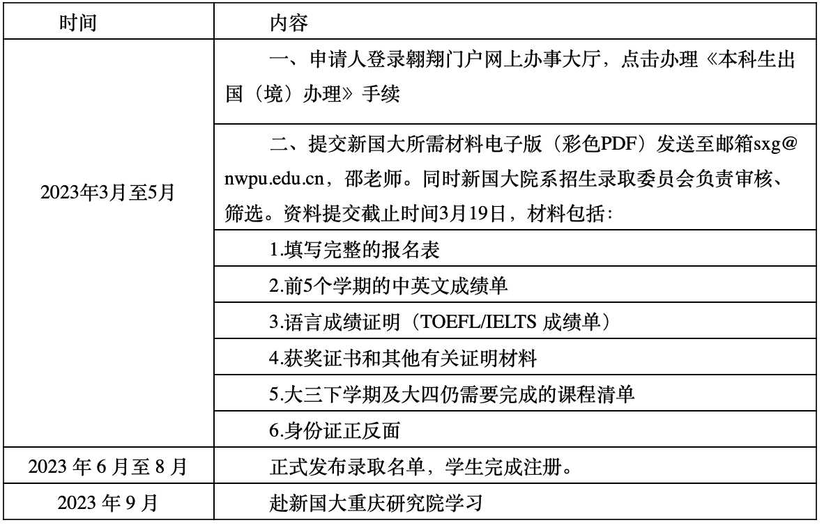 申请条件:申请人须按西工大培养计划完成前5个学期的学业,平均学分绩82分及以上。且不能有不及格课程或实践性环节。派出前,候选人须按西工大培养计划完成前三年的学业。